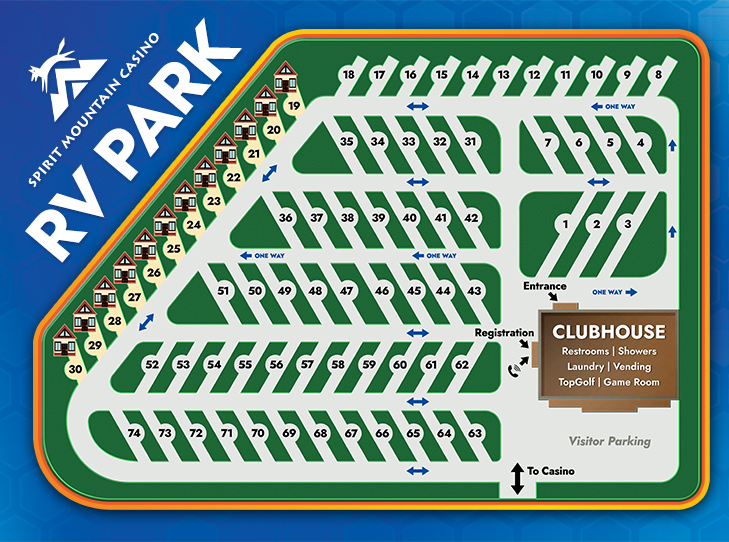 The RV Park is just steps away from the casino. After pulling off Highway 18, head southwest around the casino, just past the hotel. Refer to the map above for a visual guide regarding where to go.