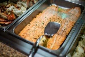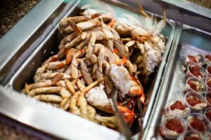 Seafood lovers, rejoice! Our buffet is a paradise for those who crave the ocean’s bounty. We offer Dungeness crab served both hot and cold, allowing you to savor this delicacy in whichever way you prefer. The hot crab is perfectly seasoned and steamed to highlight its natural sweetness, while the cold crab is a refreshing treat, ideal for a lighter bite.